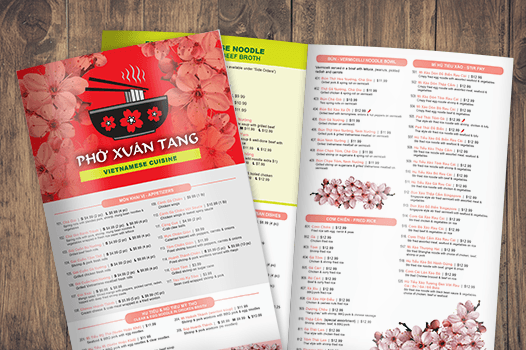 Pho Xuan Tang is the first Vietnamese restaurant in Fort Erie, ON. The name of the restaurant translates to Tang’s Spring Pho in English which serves as the guiding theme and character for the brand and interior design. The owner of the restaurant was born and raised in north Vietnam where cherry blossoms bloom in spring. Red and yellow are traditional Vietnamese colours while bright green and pale pink represents springtime.
